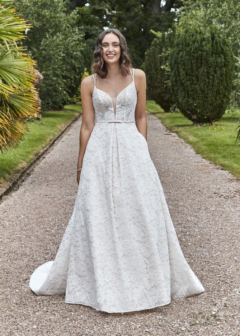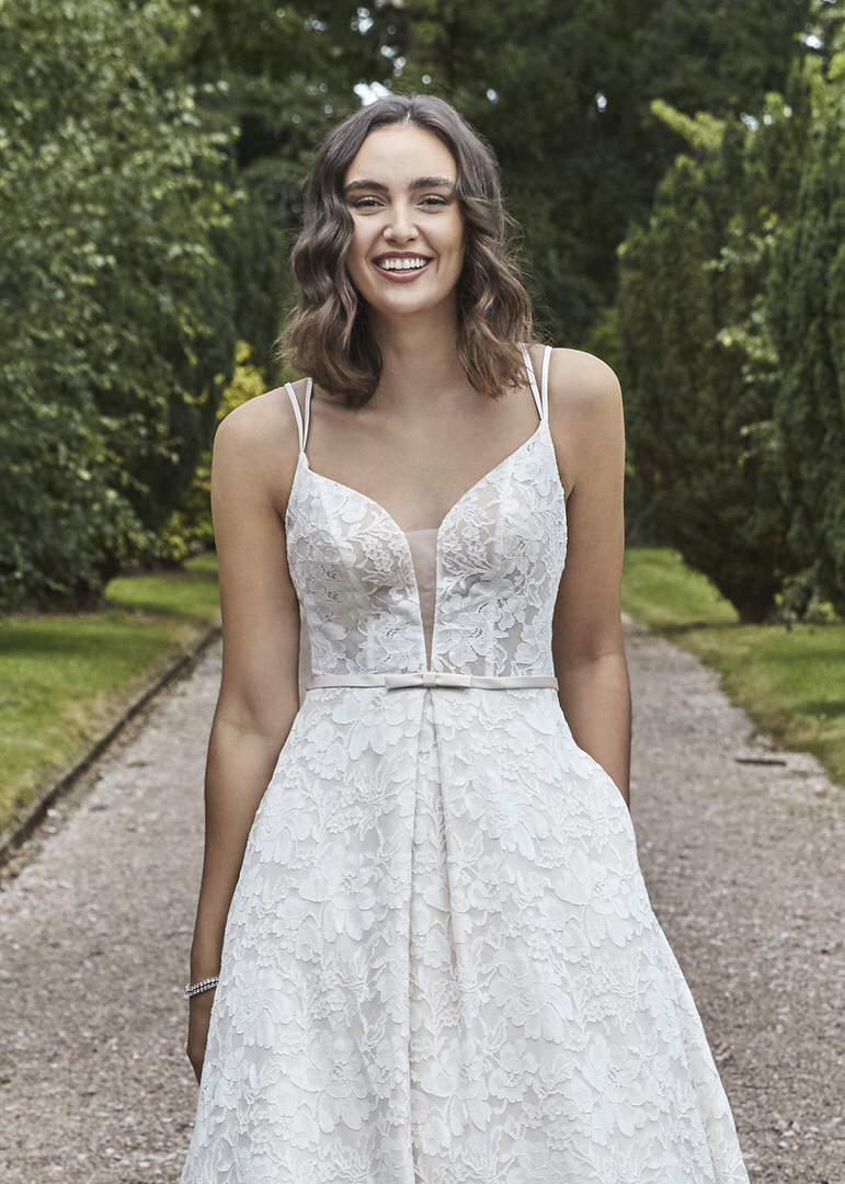 Berry is a striking full lace A-line style wedding dress with a plunge neckline, bow detail at the waist, double spaghetti straps and finished with a cross over back. Bodice can come lined or unlined at the front