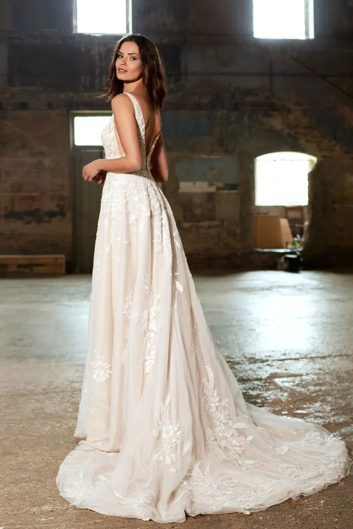 Hermes is a truly enchanting gown that captivates with its NUDE/IVORY palette. This gown boasts a gentle A-line silhouette that gracefully flows, accentuating the bride’s figure. The plunging V-neckline adds a hint of allure, while the subtle sparkle underlay beneath the floral bodice creates a mesmerizing effect. Adorned with intricate floral appliqu?s, Hermes is a dress that seamlessly blends classic and contemporary elements, making it the perfect choice for a bride who desires a unique and captivating bridal look. It’s a gown that exudes sophistication and individuality, ensuring you’ll shine on your special day.