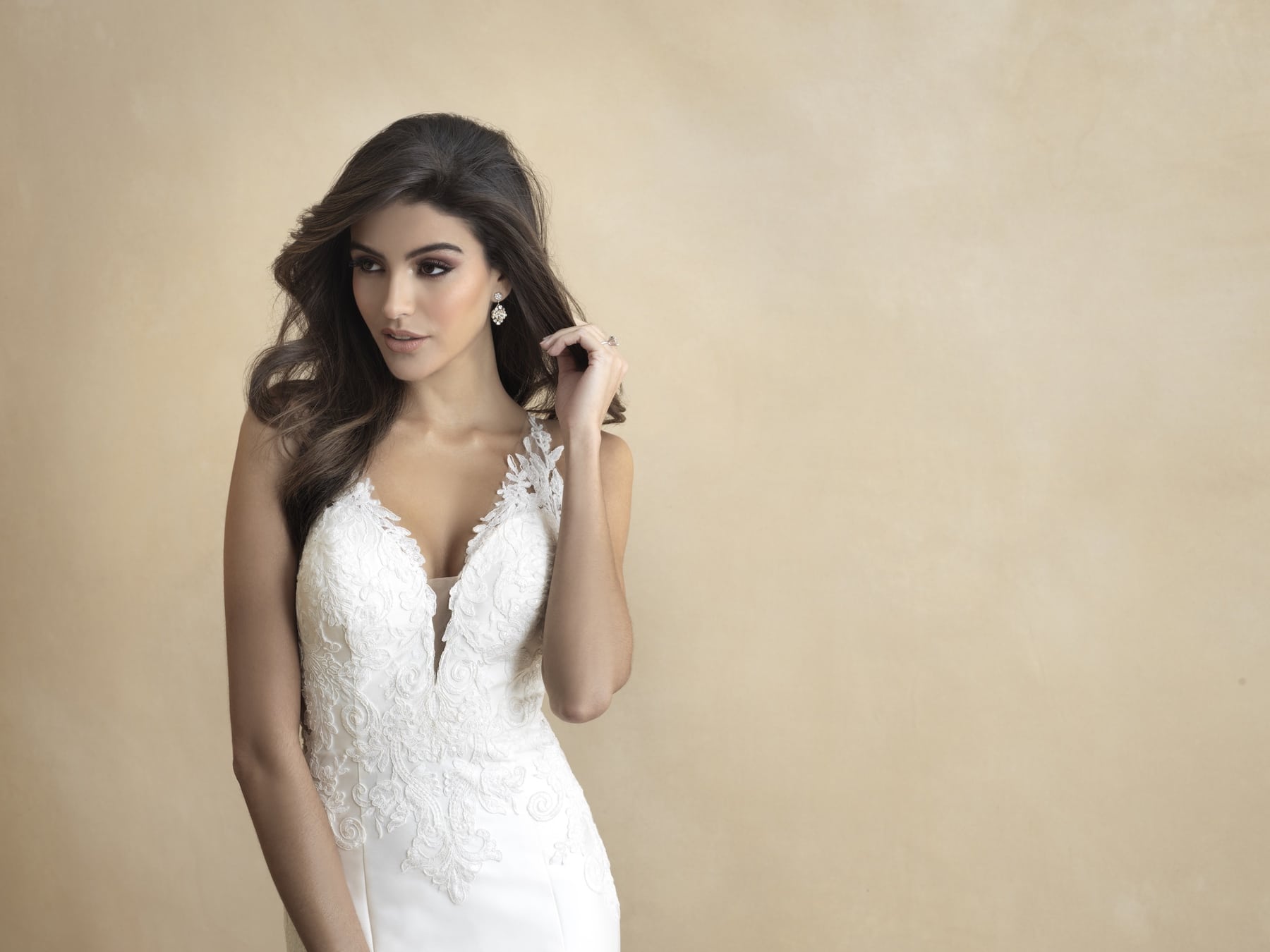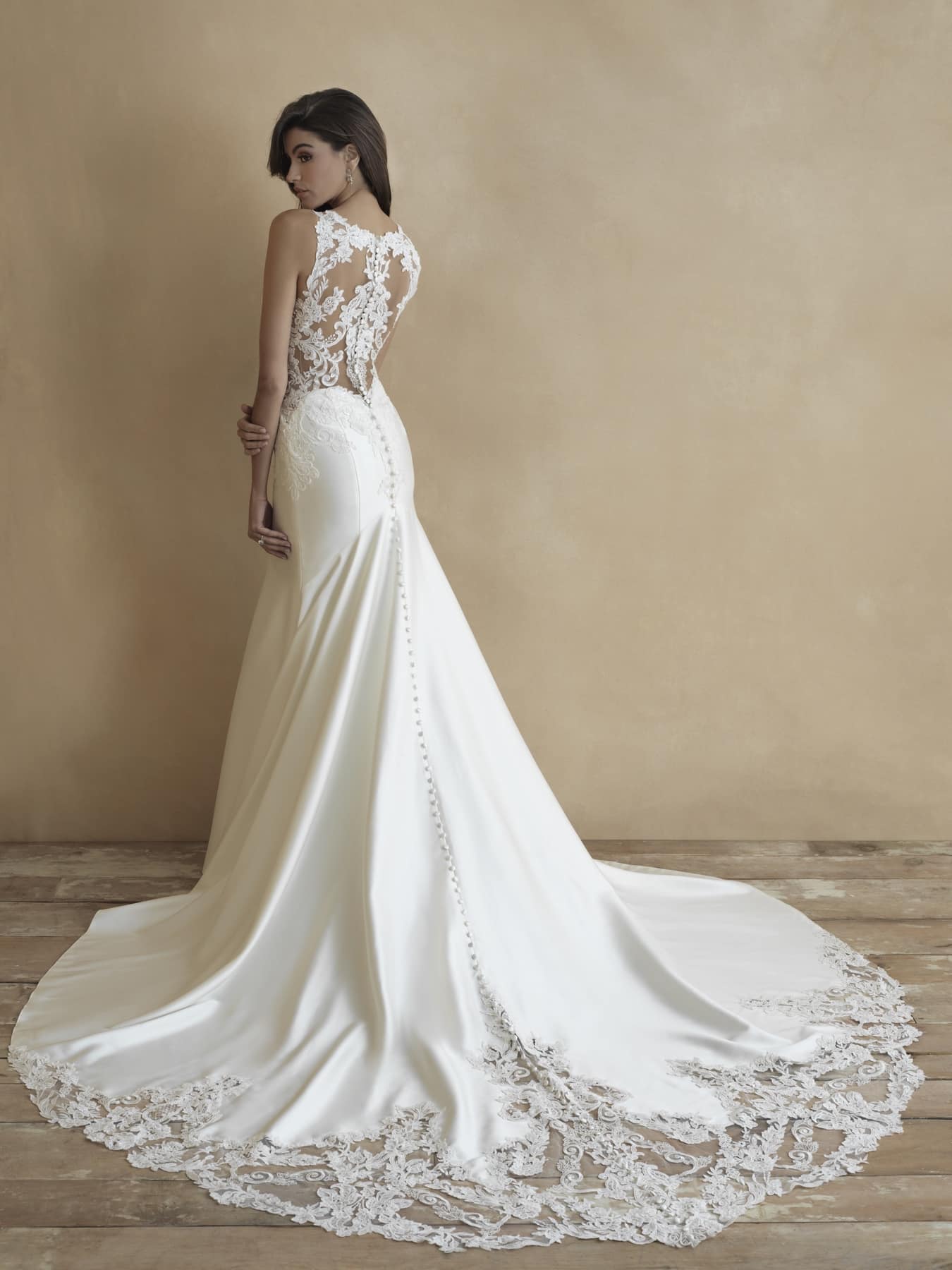 The Juniper wedding dress has a satin finish with a gorgeous contrasting illusion back filled with delicate lace appliques. Juniper is finished with a breathtaking glass lace train