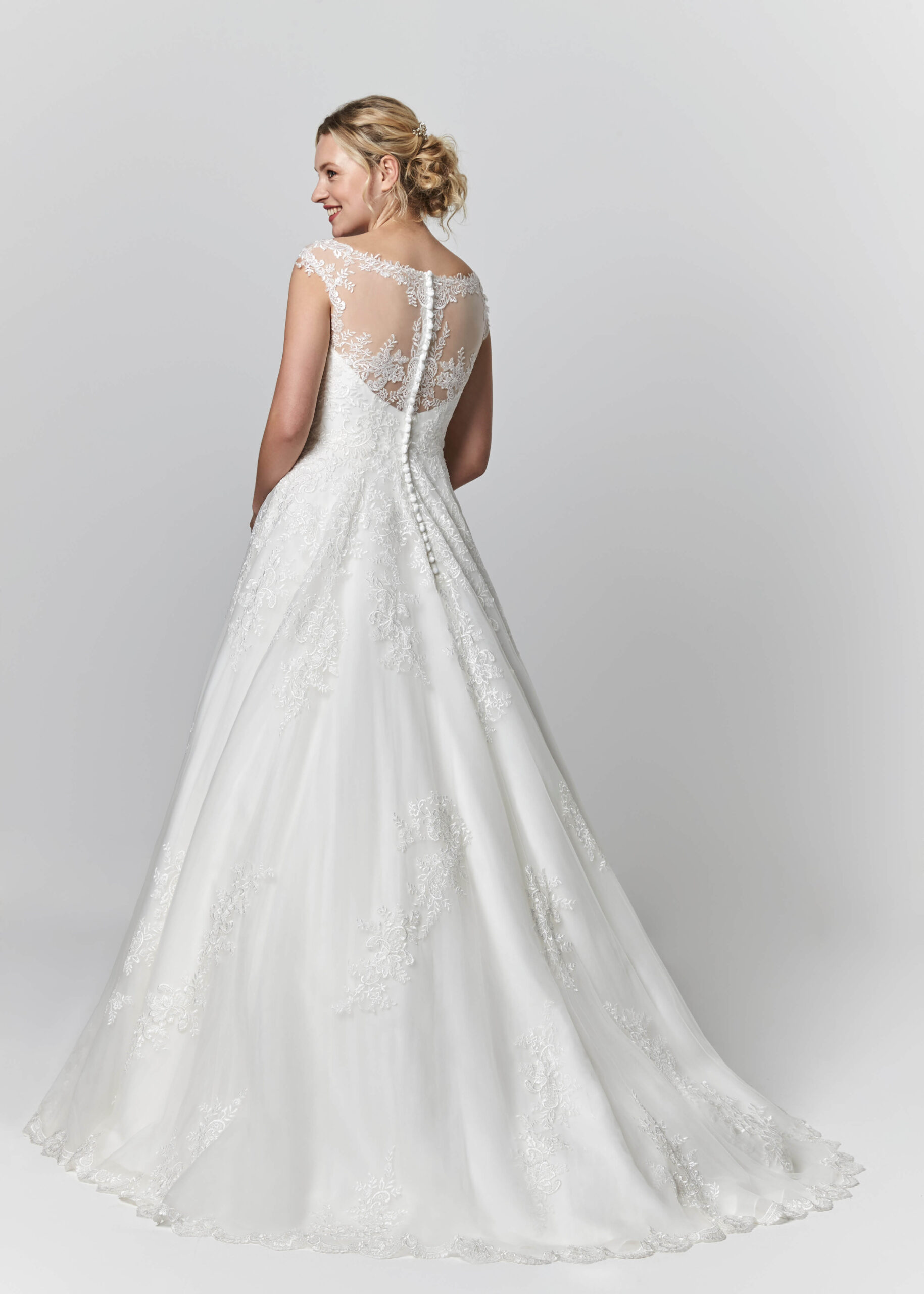 A wonderful ballgown style with a sweetheart bodice, illusion neckline, capped lace sleeves, lace motifs and finished with a pretty illusion back.