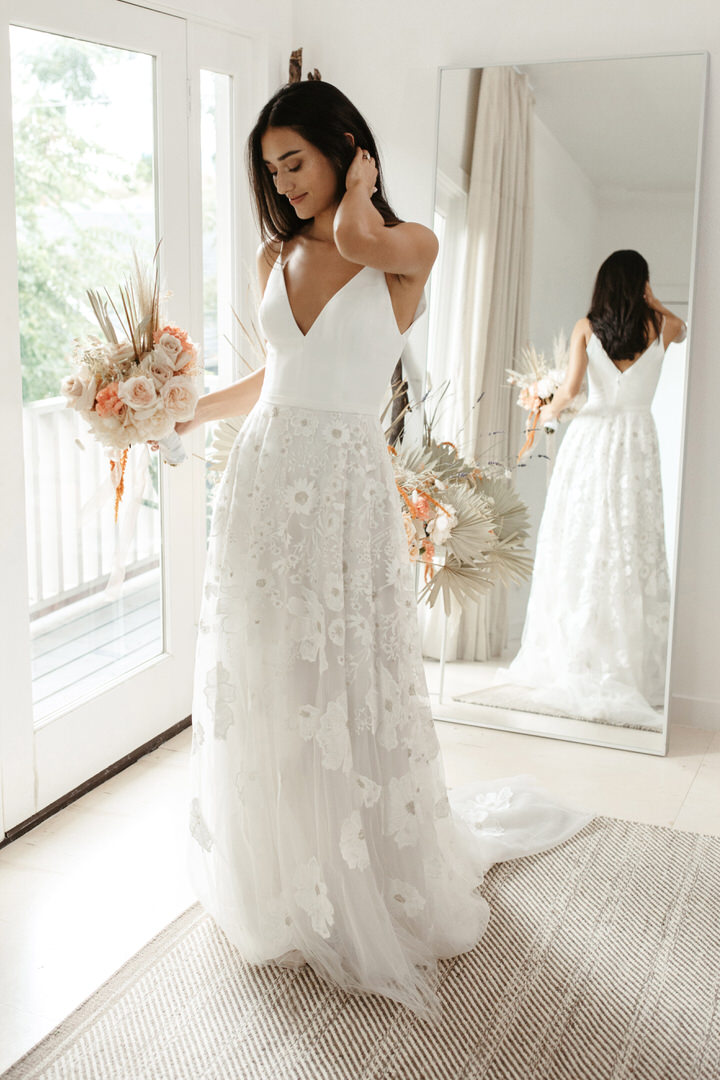 Tommie is a unique A-line wedding dress she has a clean and classic chiffon bodice with a beautiful embroidered floral skirt on titanium colour tulle