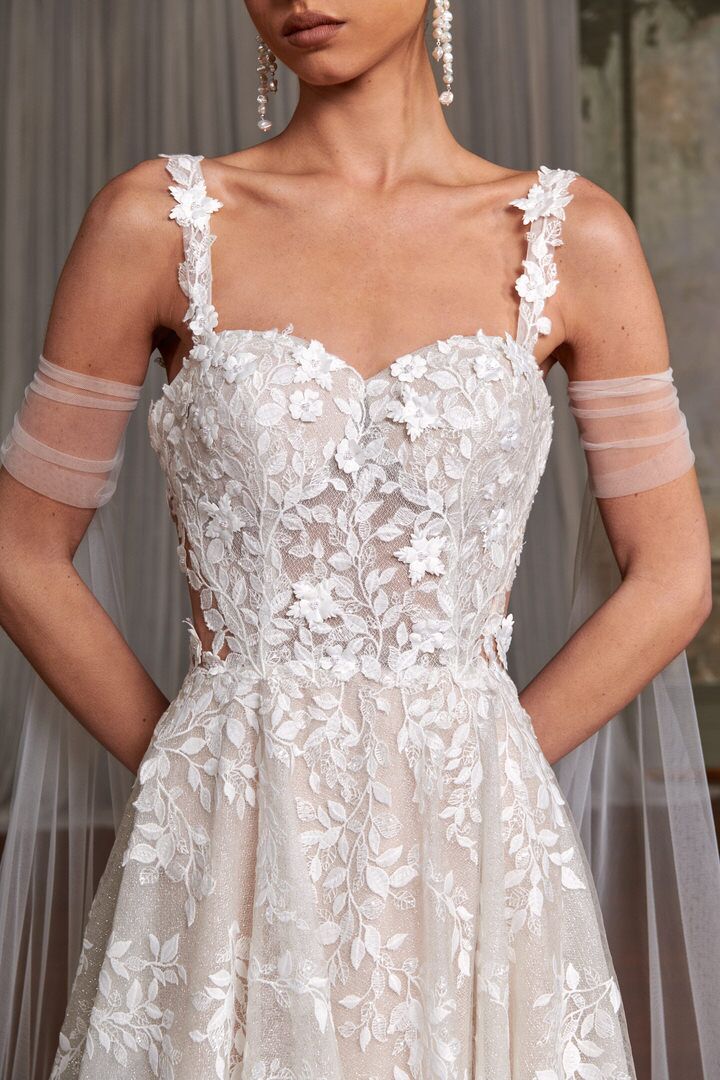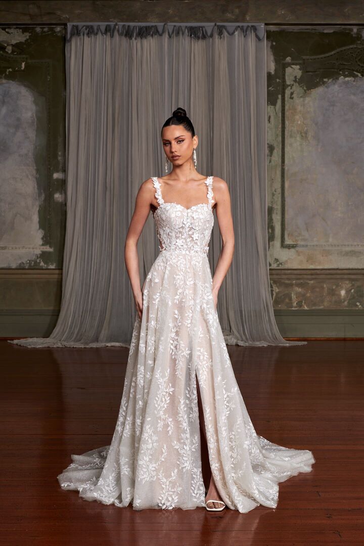 Allow us to introduce Vonnie, a wedding dress that encapsulates sheer enchantment. Adorned with breathtaking floral lace embroidery, embellished with glistening sequins, and adorned with delicate 3D flowers and pearls, Vonnie exudes a whimsical and ethereal aura.