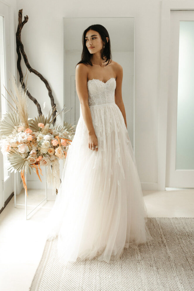 The Willowby range is part of the Watters collection renowned for their ability to pick up on trends and understand brides. Willowby sits perfectly with Watters dramatic versatile and individual approach. Think floaty and fluid fabrics reimagined with bolder contemporary shapes. Willowby takes the road less traveled, with its free spiritedness and tells a story with each dress. Pricing for our Willowby dresses range from £1000 – £1800.